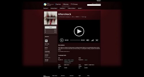 Aftershock est visible dans certaines salles, sur Itunes ou encore sur le réseau Sony (playstation). En effet le film vient de sortir simultanément sur plusieurs plateformes (cinéma et VOD) mais malheureusement uniquement au USA (voir les captures plus bas).