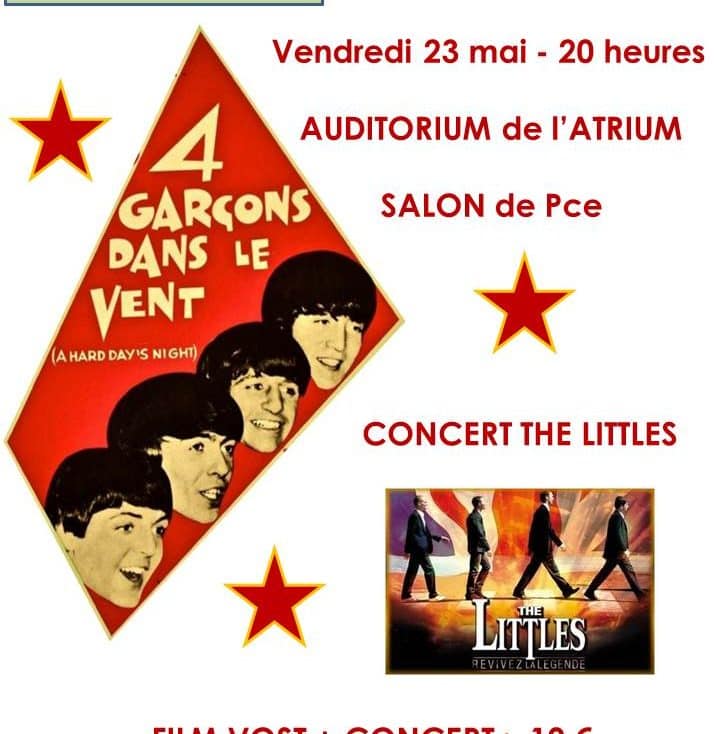 Salon de Provence, terre d’adoption pour les Beatles, vous propose une soirée incroyable le 23 mai 2014 à partir de 20H00. Au programme de cet événement qui se déroulera à l’Auditorium de l’Atrium, la projection du film 4 garçons dans le vent (a hard day’s night), suivi d’un concert des Littles, un groupe qui rend hommage au plus célèbre boy’s band britannique depuis déjà de nombreuses années. Tarif unique pour l’ensemble : 10€. Un événement organisé par l’association Une journée avec les Beatles.