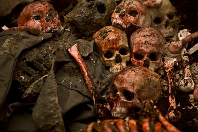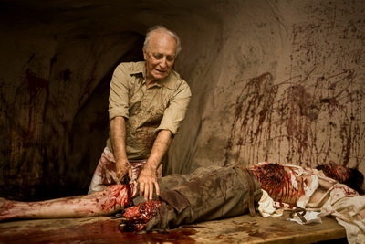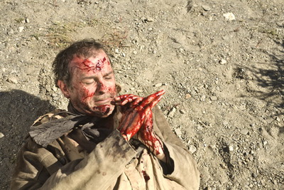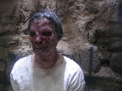 Sur ce film je me suis principalement occupé des effets gores : j’ai donc fabriqué le zombie coupé en deux, un autre avec un pistolet planté dans l’œil ainsi que le « semi décapité ». L’éventration de Dominique Bettenfeld ( super sympa ce mec! ) au début dans l’église et des fausses têtes et supports pour les explosions de têtes. Il y a eu un travail en commun avec l’équipe des effets numériques , car on faisait éclater un élément réel et ensuite il était replacé à l’endroit voulu par les infographistes. Donc un bon moyen de combiner les deux techniques prothèses / 3D… J’ai aussi fait les coups de tronçonneuse qui sont simplement des gros sachets de barbaque et hémoglobines placés dans des mannequins… Tout simple mais dégoûtant ( donc efficace 🙂 )