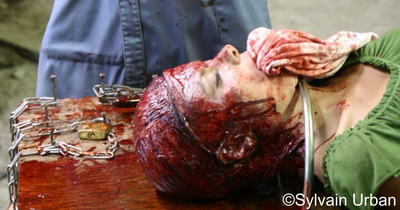 Cela dépend de ce que le réalisateur a envie de montrer. Suivant cela, je lui fais des propositions et on regarde ensemble ce qui peut produire le meilleur résultat… En règle générale, je dirais que je préfère faire un maximum de choses sur les comédiens pour davantage de réalisme… Par exemple il était prévu de montrer la mâchoire arrachée de Serge Riaboukine sur Lady Blood avec une fausse tête mais finalement j’ai décidé de poser une prothèse sur le comédien directement… au final ça a un côté très « Bis » que j’aime bien -) Parfois une fausse tête est nécessaire, pour un cadavre de Lady Blood toujours. Je voyais mal demander au comédien de rester allongé dans un sac sur la plage avec des algues dans la bouche et des crabes sur la figure -) J’ai donc décidé de faire une réplique de sa tête pour cette séquence…
