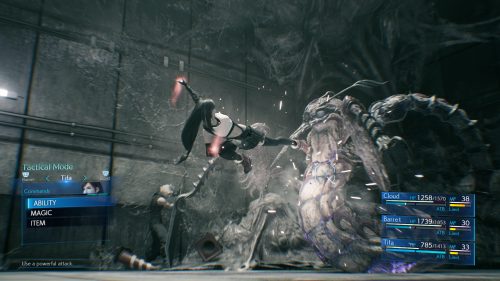 Parmi ces nouveautés, on citera notamment le système de combat. Exit les combats façon « tour par tour » du jeu original, et place aux combats dynamiques mêlant les attaques de base infinies, mais peu efficaces, à une jauge dite ATB (Active Time Battle) qui se rechargera constamment et vous permettra de lancer des attaques spéciales via un menu dédié, ralentissant le temps quand y accédez. Ces attaques spéciales sont soit dédiées aux personnages (chacun a les siennes, et vous pouvez même utiliser celles d’un personnage que vous ne contrôlez pas à l’instant T), soit peuvent être ajoutées à chacun d’eux via les matérias (des orbes renfermant des attaques spéciales, échangeables à volonté entre les personnages). Ces différents systèmes peuvent être résumés à un savant mélange entre beat’em all classique et combats au tour par tour. Ca n’a l’air de rien présenté comme ça, mais manette en main, ce système de jeu est tout simplement grisant ! Et si vous êtes hermétiques à ce changement, un système « classique » au tour par tour où vous ne gérez que la partie ATB est de la partie, même si celui-ci ne sera accessible qu’en mode Facile. Ceci dit, ne vous sentez pas honteux d’y avoir recours tant le mode Normal est déjà bien corsé. Par ailleurs, n’oubliez pas la personnalisation de vos personnages. Armes, équipements, matérias… Ne négligez aucun aspect de vos personnages tant le moindre élément pourra faire pencher la balance en votre faveur pendant les affrontements.